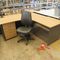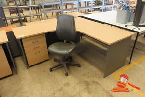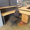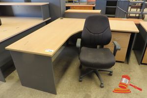 CORNER TIMBER DESK WITH PEDISTOOL AND CHAIR (DESK MARKED)