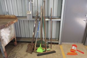 QTY OF ASSORTED SHOVELS, BROOMS AND RAKES