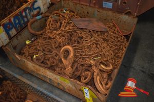 METAL CAGE OF OF VARIED CHAIN ASSEMBLYS INCLUDING 8, 16, AND 22mm CHAIN AND GRAB EYE HOOKS, OBLONGS, HAMERLOCKS AND LATCH LOCKS (YD5B-29) (DA#095208) (B#3138019)