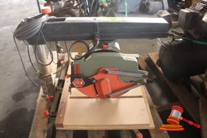 SLIDING SAW, DEWALT (MAKE), MODEL#DW1201, SERIAL#1-000287, UNKNOWN WORKING CONDITION, SOME SURFACE RUST EVIDENCE, VARIOUS SCRATCHES COMES WITH GREEN METAL BENCH - SURFACE RUST EVIDENCE, DENTS & GENERAL WEAR & TEAR