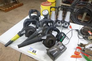 9 X ASSORTED HITACHI CORDLESS LAMPS (3), BLOWERS (4), TORCHES (2). INCLUDES 1 X BATTERY AND CHARGER