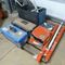 2 X MANUAL HYDRAILIC SCISSOR LIFT TROLLEYS. BLUE (KINCHROME) TROLLEY MISSING WHEELS