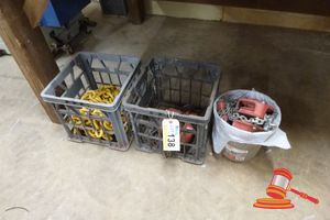 200KG HYDRAULIC BOTTLE JACK, HAMMER SET, TYRE INFLATOR AND AIR HOSE, TUB OF ASSORTED AIR TOOLS AND TUB OF SUNDRY ITEMS
