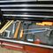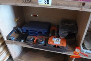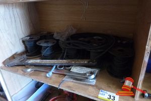 QTY OF ASSORTED AUTOMOTIVE ITEMS INCLUDING: 1 X CABINET WITH STOP/INDICATOR LAMPS, REPCO 6L PNUMATIC FILL AND EXTRACT DISPENSER (UNUSED), 4 X VEHICLE SAFETY TRIANGLES, MACNAUGHT RETRACTA RETRACTABLE AIR HOSE REEL, ASSORTED TOOLS AND SUNDRY ITEMS