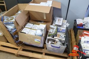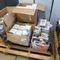 PALLET OF ASSORTED GALVANISED BRACKETS, 4 X 20KG BAGS ADBRI RAPID SET CONCRETE (GOOD) 200 X 200MM TILES, 3 X 2KG BAGS OF GROUT (SAND COLOUR) AND SUNDRY ITEMS