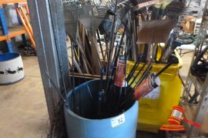 3 X POST HOLE SHOVELS AND TUB OF ASSORTED ITEMS