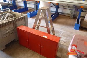 METAL 3 DOOR WALL MOUNTABLE STORAGE CABINET. LIGHT WEIGHT. 2 DOORS LOCKED (NO KEY) APPROX 1200 X H600 X 200MM, 1 X ALUMINIUM STEP LADDER. HEIGHT 1150MM