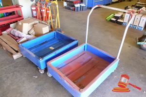 2 X MOBILE TROLLEYS WITH PLASTIC TUB BASES (950 X 750MM). 1 WITH NO HANDLE