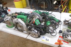 10 X ASSORTED HITACHI CORDED ANGLE GRINDERS, CIRCULAR SAWS, DRILLS. (1 X OUT OF SERVICE TAG)