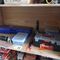 6 X STIHL HARNESSES, 2 X STIHL HELMETS WITH EAR MUFFS AND MESH FACE SHIELDS, ASSORTED WHIPPER SNIPPER CORDS AND METAL / TIMBER SHELVING UNIT (BOLT TOGETHER)